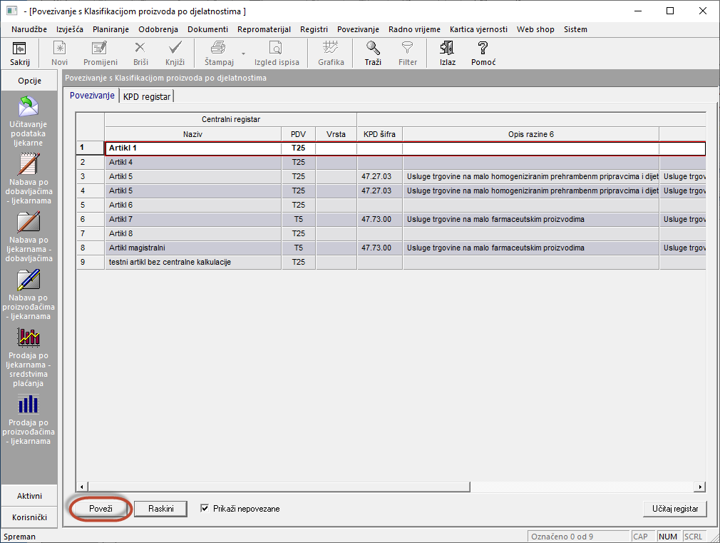 U kartici "Povezivanje", označite artikle kojima želite povezati KPD šifru
