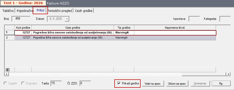 - specifikacije kojima prihvaćeni iznos ne odgovara iznosu za naplatu potrebno je ispraviti na način da se pozicionirate na navedenu specifikaciju, a zatim u pregledu "Prilozi" odaberite parametar "Prikaži greške":
