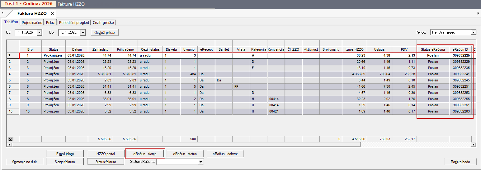 - u slučaju u kojem su svi recepti unutar specifikacije u potpunosti prihvaćeni od strane HZZO-a, odnosno iznos specifikacije "Za naplatu" odgovara iznosu "Prihvaćeno", specifikacije je potrebno proknjižiti i generirati izlazni eRačuna prema HZZO-u, odabirom opcije eRačun slanje: