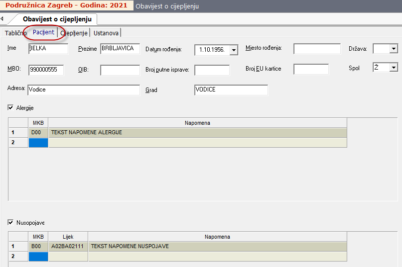 - osnovne podatke pacijenta moguće je ažurirati dok je za dodavanje alergija ili nuspojava potrebno aktivirati željeni upis, a zatim dopuniti podatkom MKB šifre i napomene (nije obvezno)