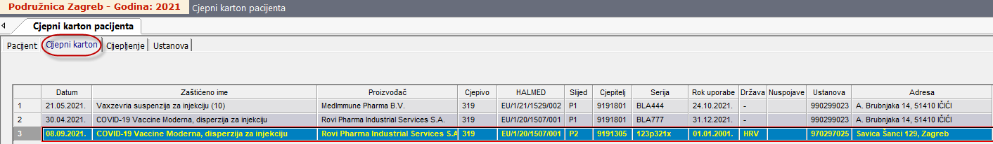 Pod opcijom "Cijepni karton" vidljive su evidencije svih cijepljenja s podacima kada je pacijent cijepljen, podacima cjepiva te podacima cjepitelja: