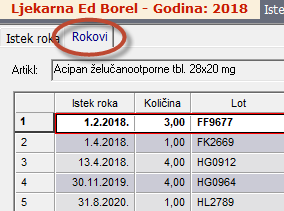 * na slici je primjer isteka roka do 12.05.2018. gdje je vidljivo da artiklu Acipan u sljedećih 30 dana istječu 8 komada s 3 različita roka! (01.05.2018, 01.04.2018, 13.04.2018)