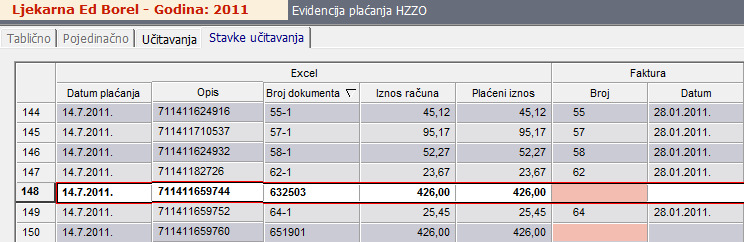 Program neće povezati stavke koje se ne odnose na fakture (naknada za plaće pripravnika, naknada za CEZIH/internet,...) te stavke kojima je pogrešan (nepostojeći) broj dokumenta.