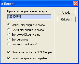 - ako u opciji Sistem -> Opcije i parametri - E-Recepti uključite parametar "Štampanje popisa na POS štampa?/strong>" program će prije prikaza prvog eRecepta na pos štampa?ispisati popis svih recepata odabranog pacijenta. Ako parametar nije aktiviran može se aktivirati i pojedinačno za određenog pacijenta prilikom dohvata eRecepata na blagajni trenutnim uključivanjem opcije "Štampanje popisa na POS štampa?/strong>"