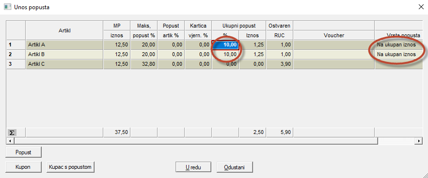 U slučaju da je odabran popust na ukupan iznos računa od 10%, Artikl A također bi preuzeo taj popust obzirom da je u tom slučaju veći od postojećeg popusta od 7.5%.
