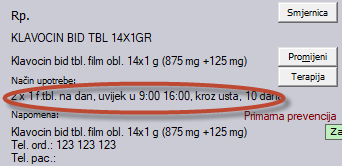 - Strukturiranu terapiju gdje je način upotrebe najčešće u formatu npr. "2X1 tbl na dan, uvijek u 9:00, 16:00, kroz usta... " :