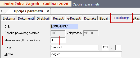 Broj blagajne upisuje se u Sistem -> Opcije i parametri - Fiskalizacija: