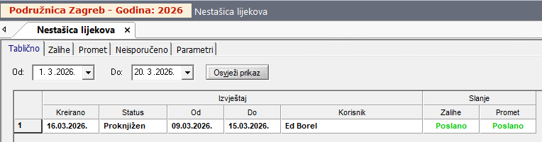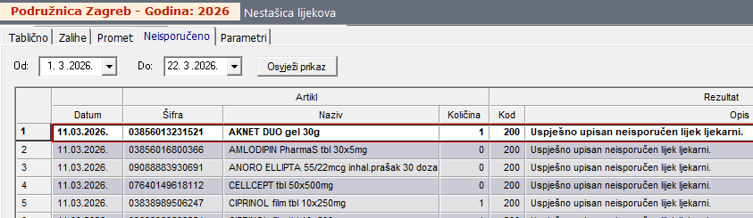 Sve poslane ili neposlane poruke moguće je provjeriti u Izvještaji › Nestašica lijekova › „Neisporučeno“ .
