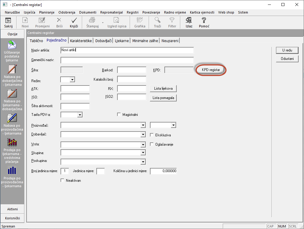 KPD šifra može se povezati i u opciji Registri -> Centralni registar -> Pojedinačno na postojećim artiklima i pri unosu novih artikala pritiskom na gumb "KPD registar", nakon čega se otvara dialog sa šiframa kao i u prethodnoj opciji: