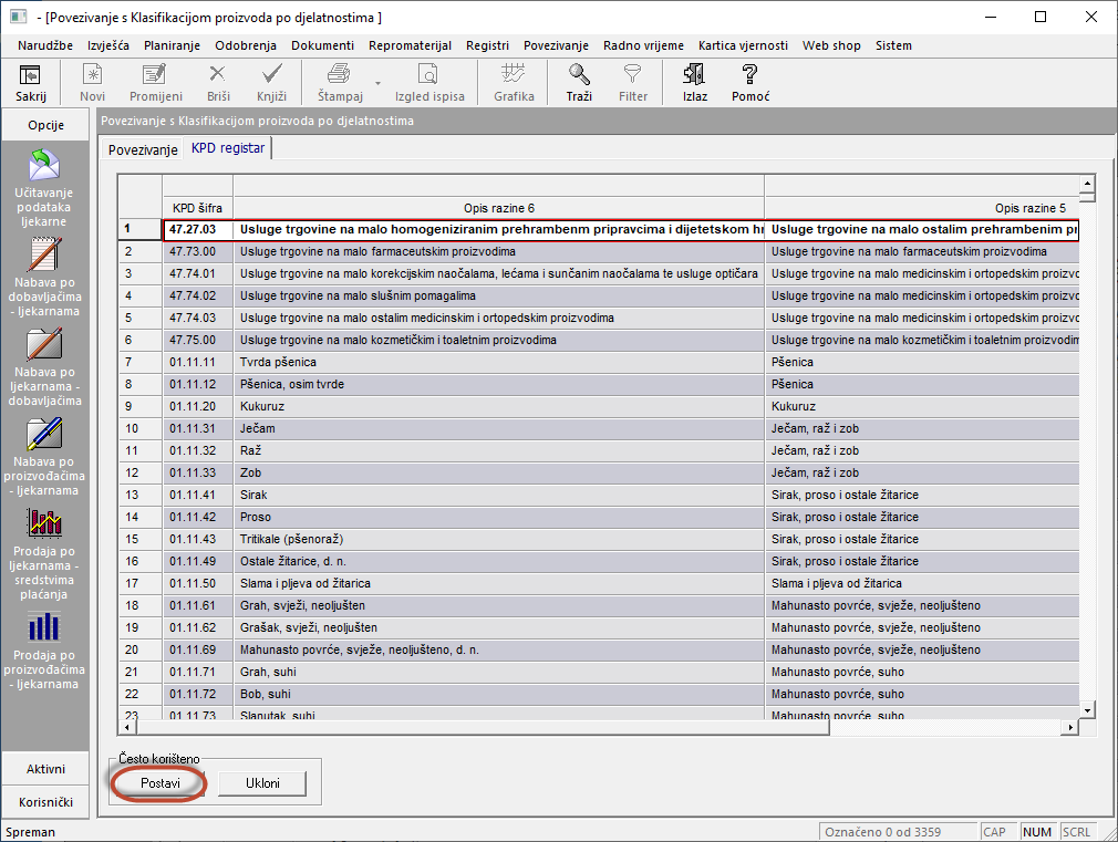 U kartici "KPD registar" označite šifru koju želite označiti kao često korištenu te kliknite na gumb "Postavi"