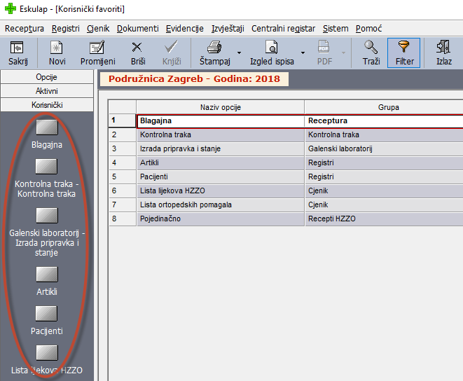 Opcija korisnički favoriti omogućuje kreiranje osobne trake s prečacima opcija programa EskulapWin.
