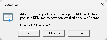 Prilikom knjiženja računa, ako neka od stavki nije povezana s KPD šifrarnikom, otvorit će se prozor s obavijesti. Klikom na opciju „Otvori“ prikazat će se izbornik Registar -> KPD , gdje je moguće povezati artikl s odgovarajućom KPD šifrom.
