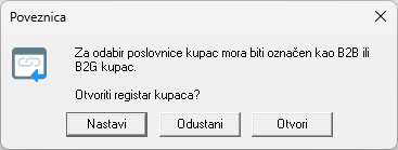 Ako kupcu nije dodijeljen tip slanja eRačuna, klikom na tipku za odabir poslovne jedinice otvorit će se prozor s obavijesti. Klikom na tipku „Otvori“ prikazat će se pojedinačni pregled odabranog kupca kako bi se lakše odabrao odgovarajući tip slanja eRačuna.