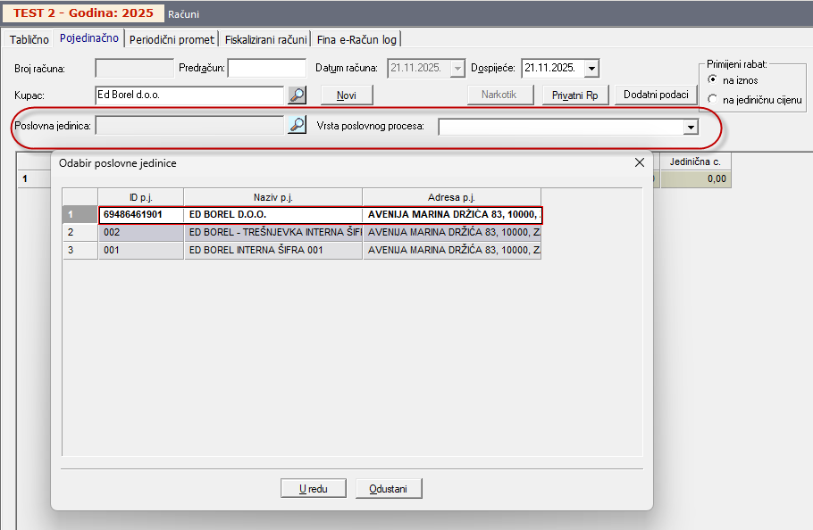 Unos računa izvodi se na način kao i do sada osim što dodatno obvezni podaci za unos postaju poslovne jedinice kupca te vrsta poslovnog procesa.
