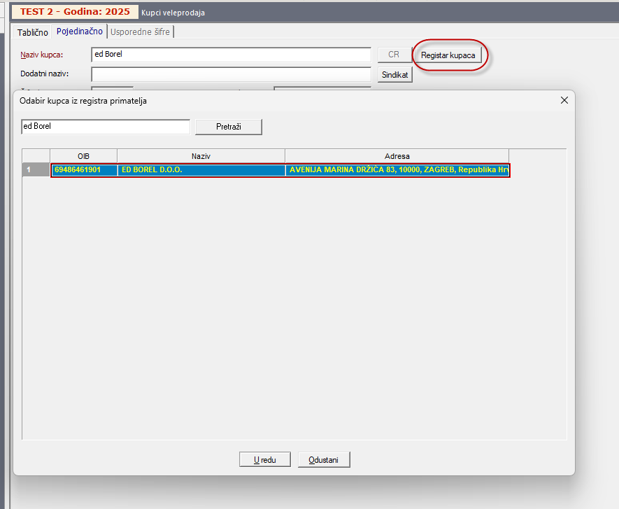 Ako postoji potreba za definiranjem novog kupca, a traženi kupac već postoji u FINA registru kupaca, moguće ga je dodati klikom na tipku „Registar kupaca“.