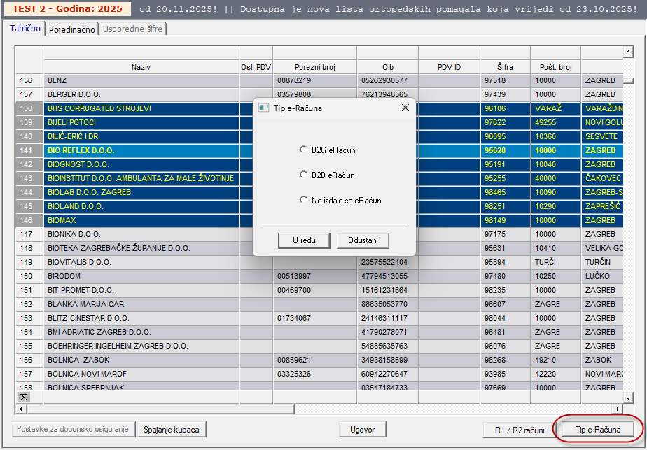 Također je moguće postaviti tip eRačuna za više kupaca odjednom. U tabličnom prikazu kupaca označite željene kupce te kliknite na tipku „Tip eRačuna“ (označenu na slici niže).
