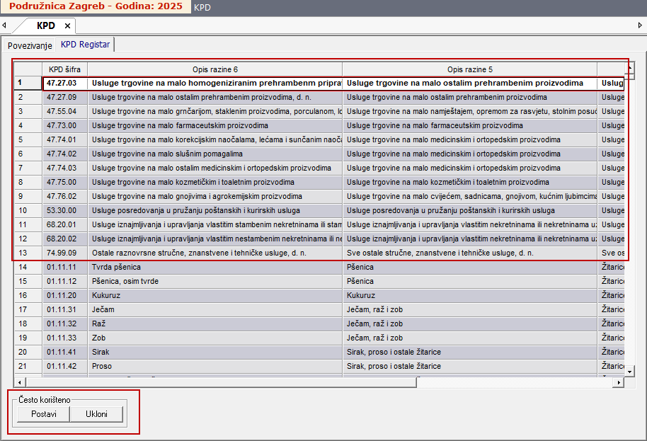 U kartici "KPD registar" označite šifru koju želite označiti kao često korištenu te kliknite na gumb "Postavi"