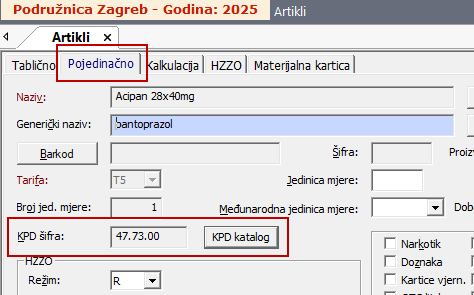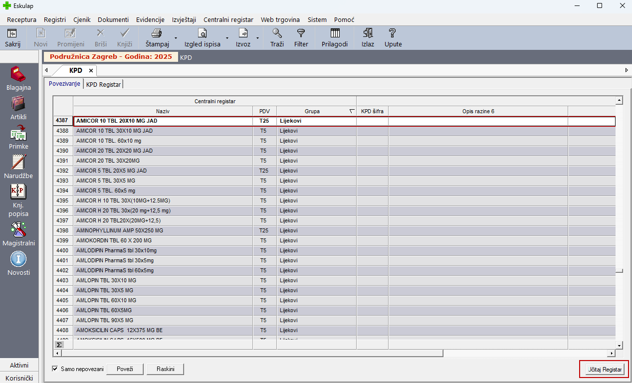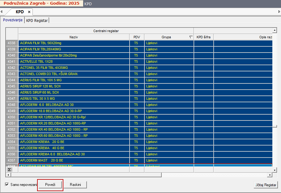 U inicijalnom pregledu opcije Registri - KPD vidljiv je kompletan registar ljekarne s opcijama povezivanja i raskidanja veze, a uz svaki povezani artikl vidljiva je njemu pripadajuća KPD šifra.