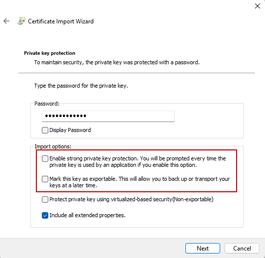 - Kod instalacije se samo sljedi potvrda odabirom opcije "Dalje"osim u drugom koraku kada je važno da se ne postave oznake na Enable strong private key protection i Mark this ey as exportable: