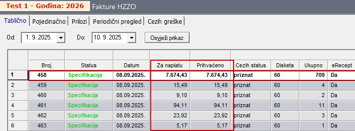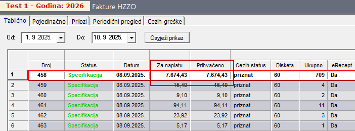 - Radi se o idealnom slučaju u kojem su svi recepti unutar specifikacije u potpunosti prihvaćeni od strane HZZO-a. Iznos specifikacije "Za naplatu" odgovara iznosu "Priznat"