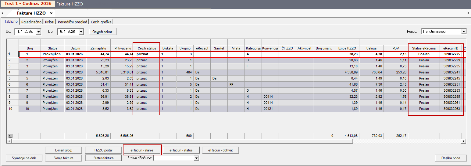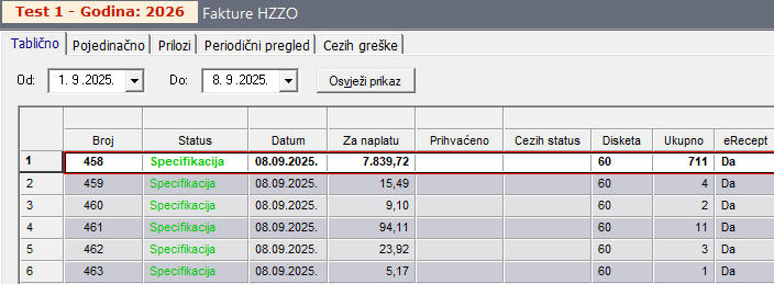 Stavke bez navedenih statusa ceziha potrebno je označiti te poslati na portal HZZO-a odabirom opcije "Slanje Specifikacije"