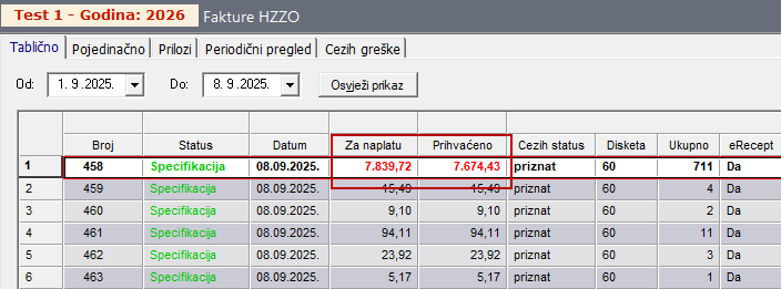 U tom slučaju su iznosi „Za naplatu“ i „Prihvaćeno“ prikazani su crvenom bojom te iznos „Prihvaćeno“ umanjen za vrijednost recepata koji sadrže grešku: