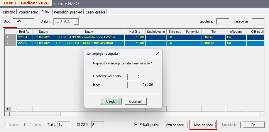 Pošto se iz specifikacije može generirati eRačun samo ako su svi recepti prihvaćeni bez greške, sve recepte iz prikaza (recepte koji sadrže grešku) potrebno je ukloniti iz specifikacije na način da se recepti označe, a zatim putem opcije "Ukloni sa spec." postavi u status za uklanjanje: