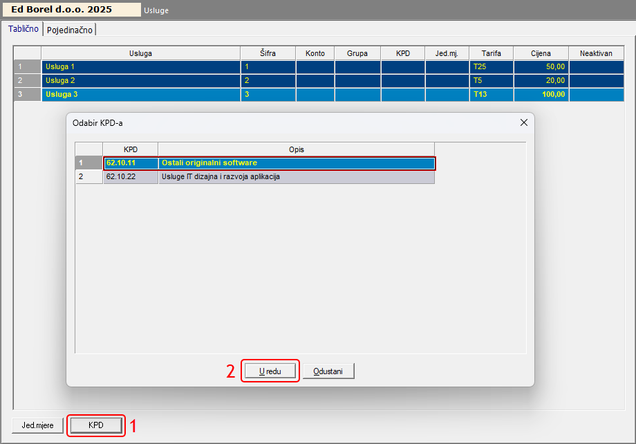 - sve usluge koje imaju istu KPD šifru, klikne se na gumb KPD i izabere KPD šifra