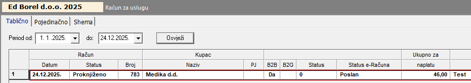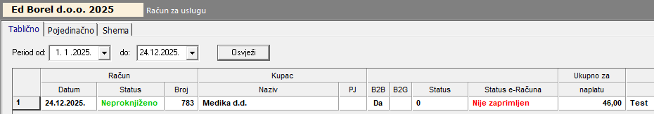 Program će nam javiti koliko je izlaznih e-Računa za odabranu poslovnu jedinicu u određenom periodu učitano i ažurirano :