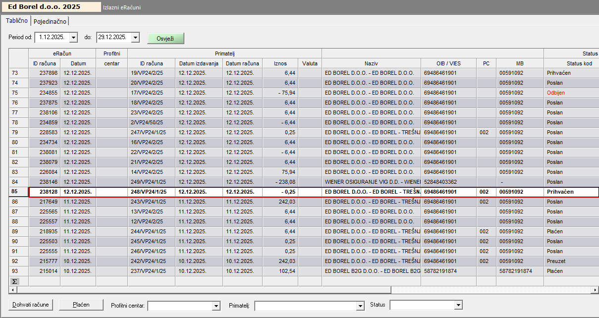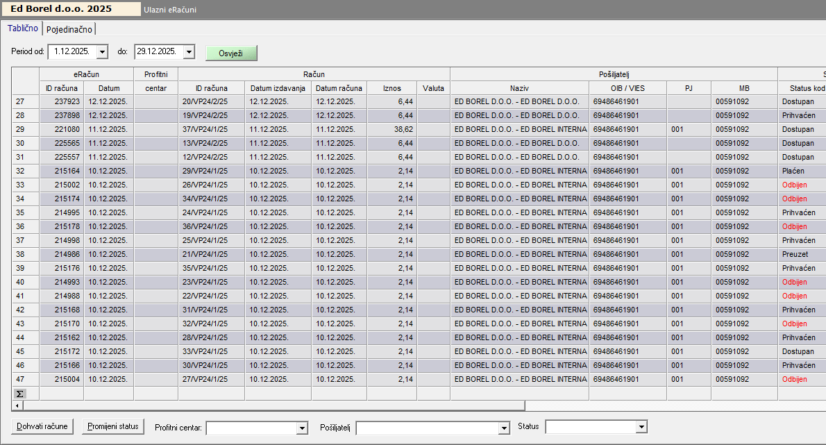 Prikazani e-Računi mogu se filtrirati po periodu, profitnom centru (poslovnoj jedinici), pošiljatelju i statusu.