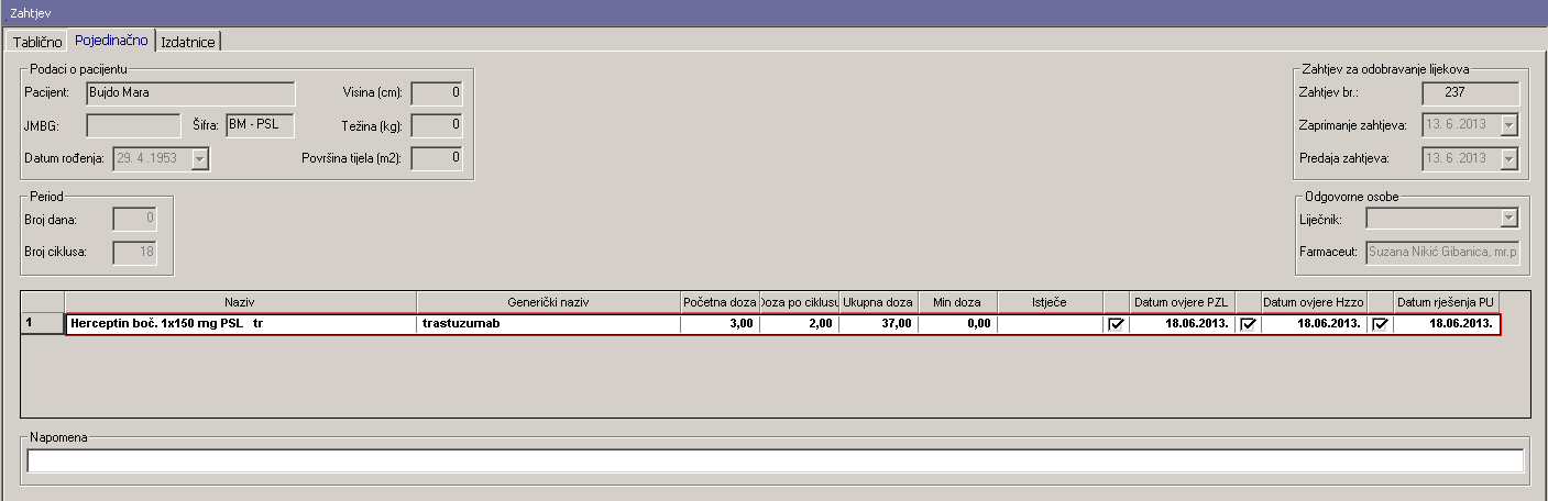 Lijekove koje je odobrio liječnik iz registra posebno skupih lijekova, zatim početnu dozu, dozu po ciklusu i minimalnu dozu u mg.
